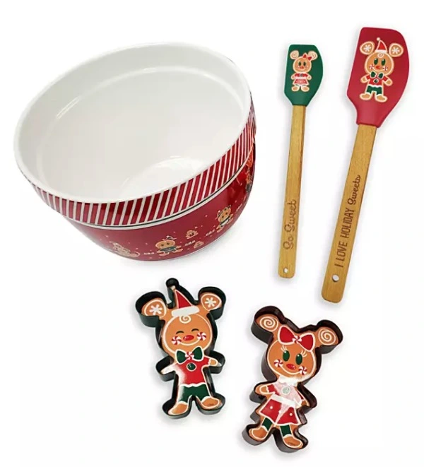 Warm hearts and your kitchen with some freshly baked holiday treats. Mickey and friends are on hand to help you mix up something sweet and festive with this set that includes a bowl, two spatulas, a Mickey cookie cutter and a Minnie cookie cutter.