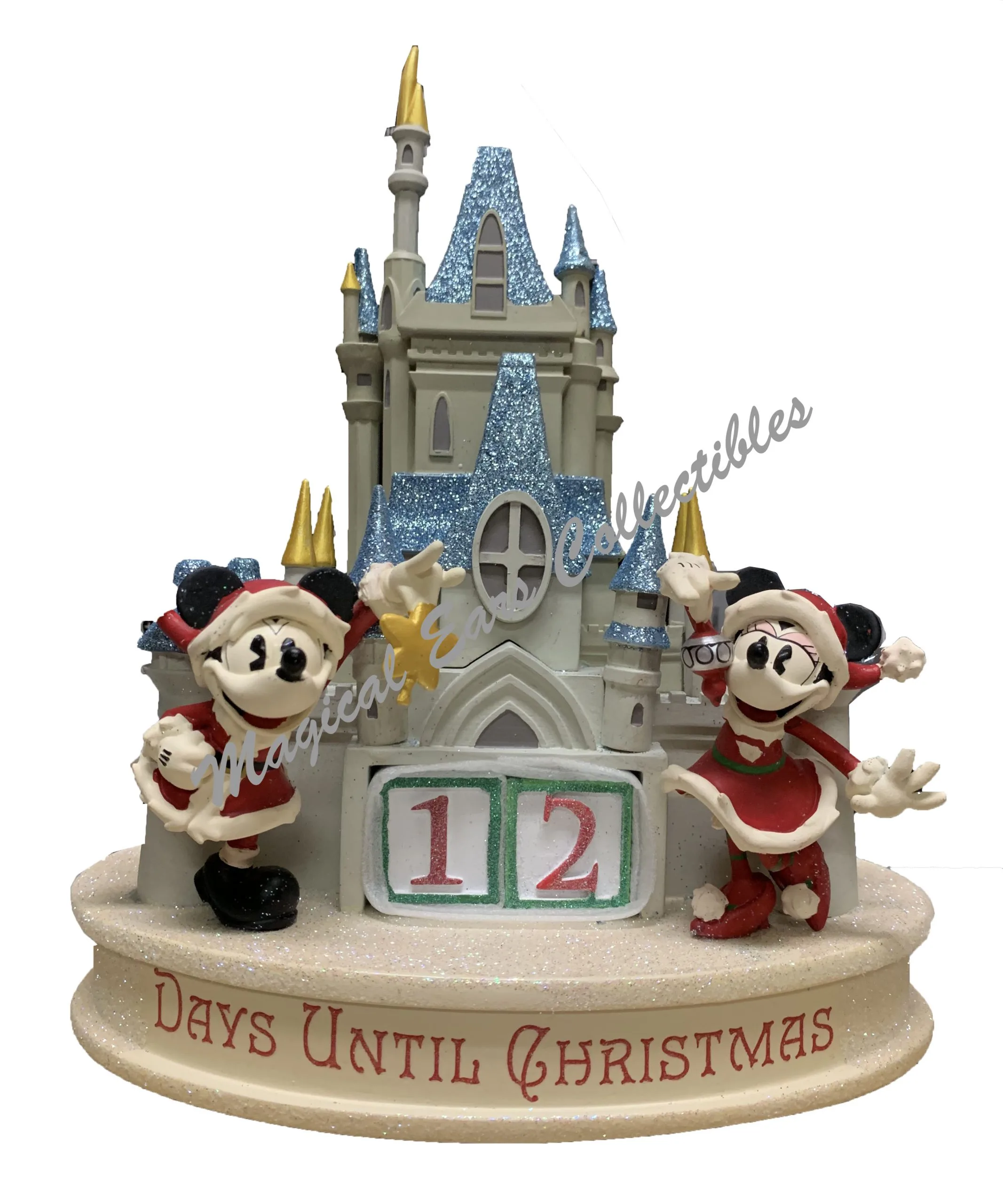 Count down the days until Christmas on this sparkling castle figurine. The castle-shaped centerpiece holds two blocks that you can turn each day to display the correct waiting time with Mickey and Minnie on the side.