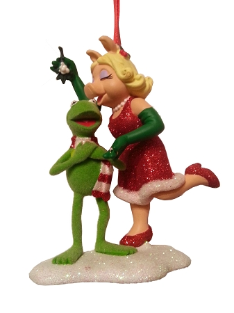 This Muppets ornament is just sweet as can be. Features Miss Piggy giving Kermit the Frog a kiss under the mistletoe she is holding above his head, with a ring on her finger. She is dressed in her Christmas dress and shoes full of glitter, clearly all ready for the holidays.