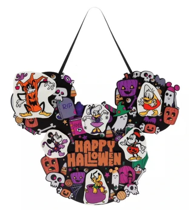 Halloween is always more fun when you have Mickey and his friends hanging around. The gang are pictured amongst the colorful montage of Halloween-themed items that comprise the Mickey ear-shaped wreath that you can welcome trick or treaters with when you hang it on your front door.