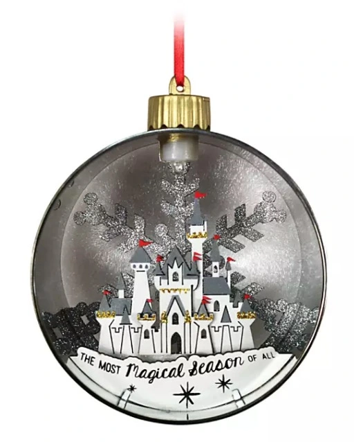 Our gleaming glass ball ornament lights-up your life from windows on both sides, illuminating a Fantasyland Castle and glittering snowflake. Celebrate the most magical season of all with this elegant heirloom treasure.