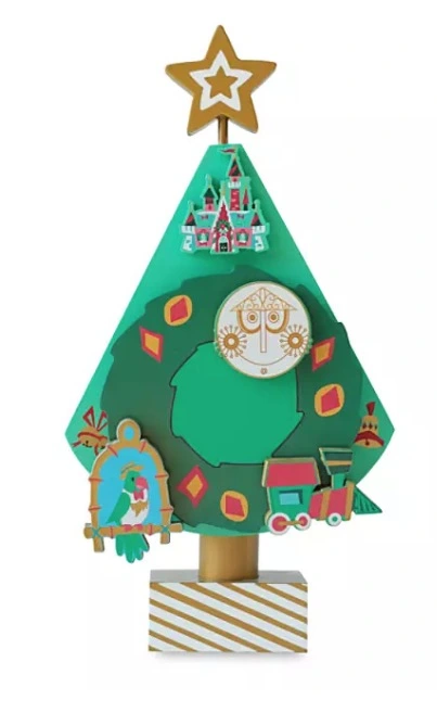 Enjoy a nostalgic element in your holiday décor this year with our wooden, wind-up musical Christmas tree. The rotating wreath features Disney it’s a small world clockface, Enchanted Tiki Room bird and a train engine, while the painted elements are inspired by more Disney Parks favorites.