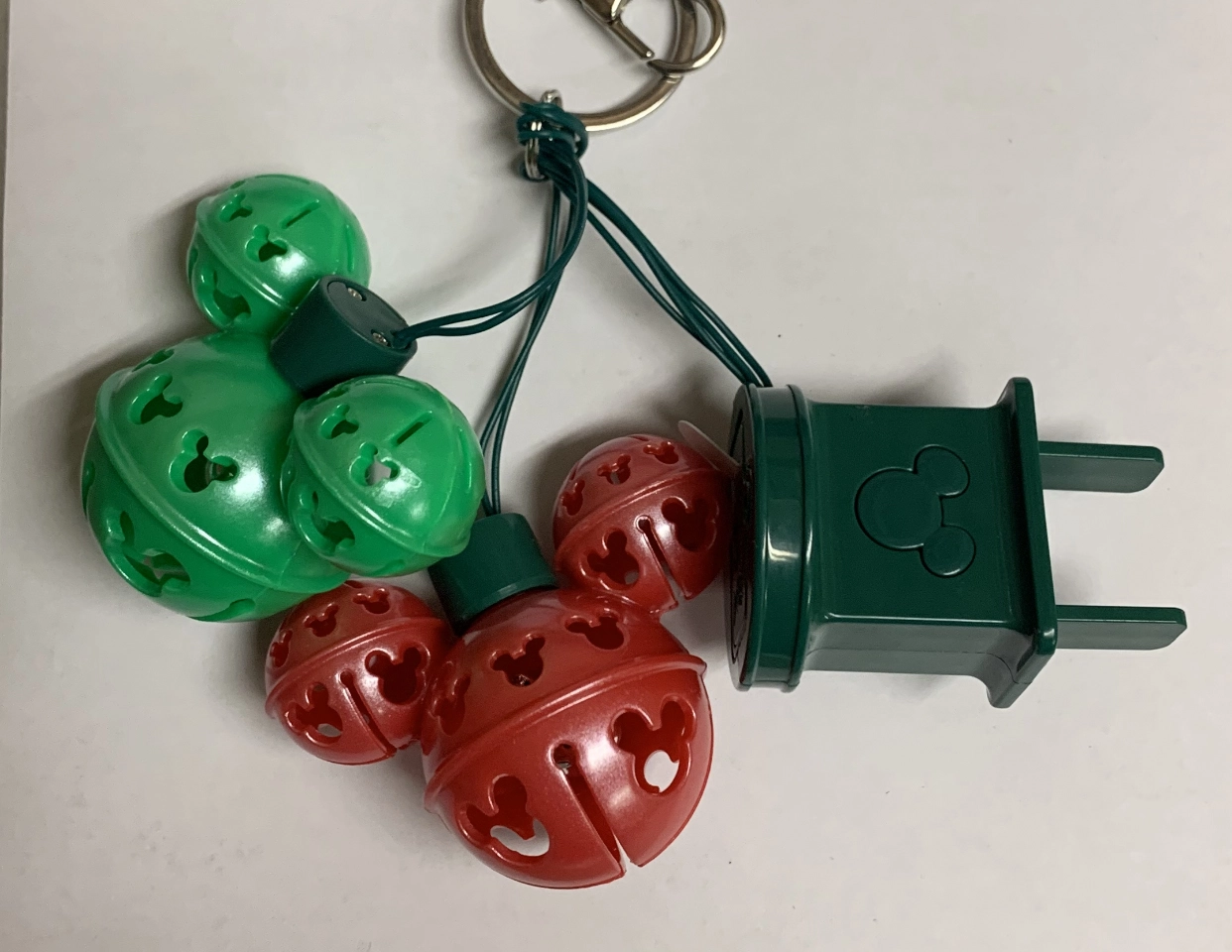 Enjoy the Holidays this year with this fun Keychain, that Features 2 Mickey Bells, and a light plug. Press the Mickey Icon and enjoy 3 light up settings.
