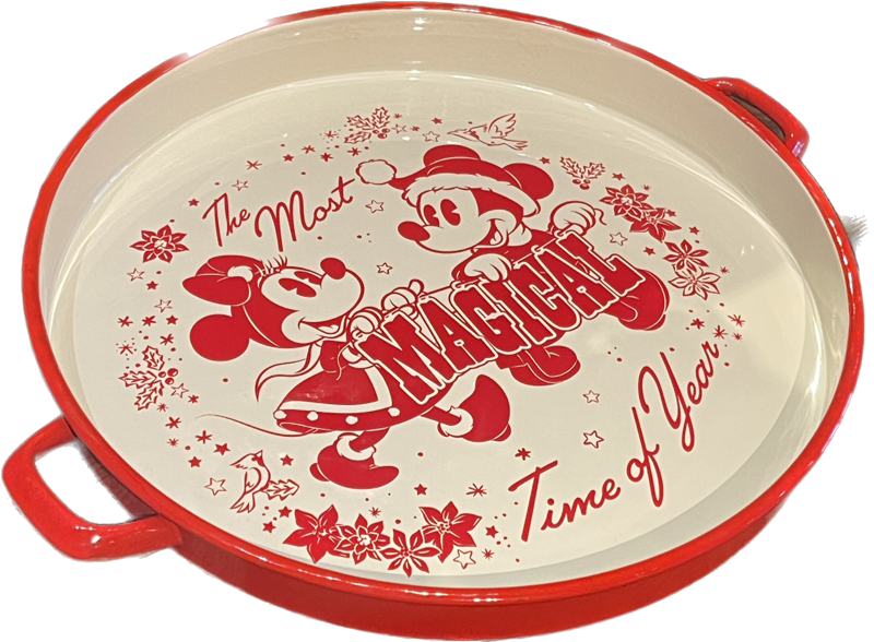 Serve up some cookies or goodies with this large Serving Tray. Features 2 handles to carry it, and has Mickey and Minnie Mouse surrounded by poinsettias and snowflakes, and the words “The Most Magical Time of Year.”