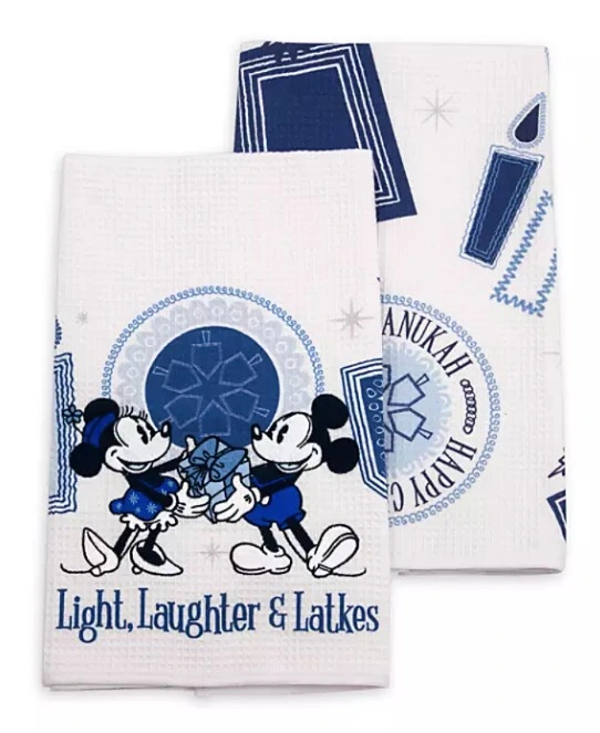 - One towel features embroidered Mickey and Minnie appliqué, screen art and ”Light, laughter & latkes” text