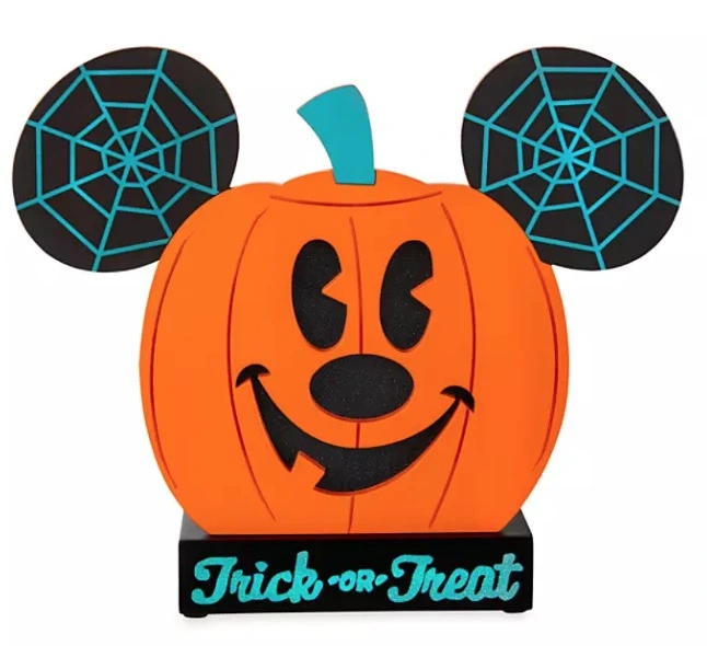 Mickey makes the perfect treat for your Halloween décor. This flat wooden figure of his smiling jack-o’-lantern face featuring spider web ears lights up with a flip of the switch.