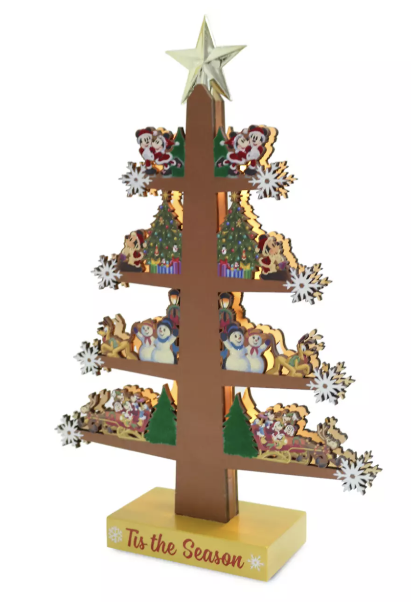 Santa Mickey is sure to brighten up the holidays with this decorative light-up tree. Each wooden branch features a festive scene involving Mickey and his friends and a light-up snowflake, while a silver star tops things off.