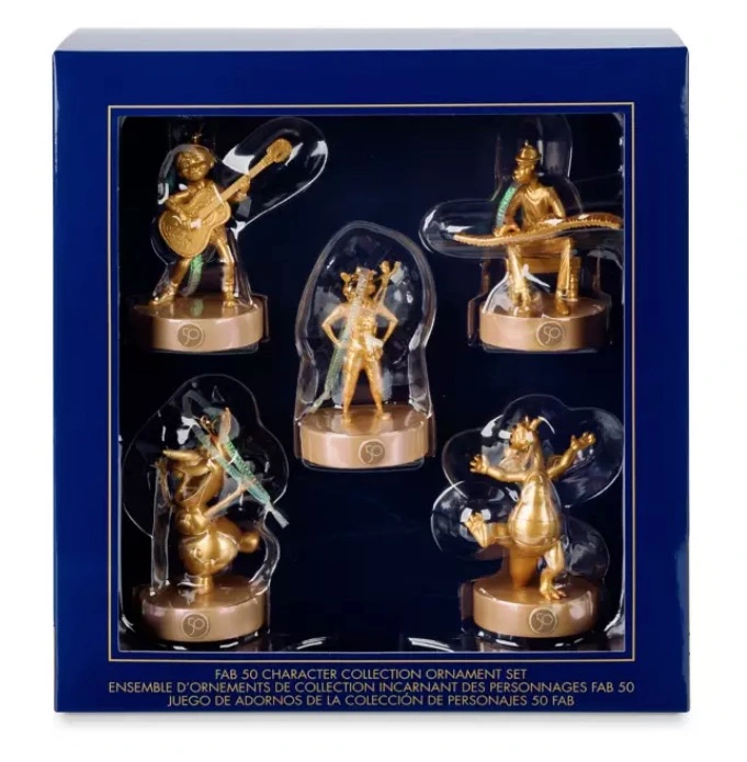 Join The World’s Most Magical Celebration with a boxed collection of five of our golden Disney Fab 50 character ornaments corresponding to statues on display at EPCOT for Walt Disney World 50th Anniversary Celebration.