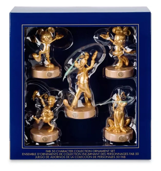 Join The World’s Most Magical Celebration with a boxed collection of five of our golden Disney Fab 50 character ornaments corresponding to statues on display at the Magic Kingdom for the Walt Disney World 50th Anniversary Celebration.