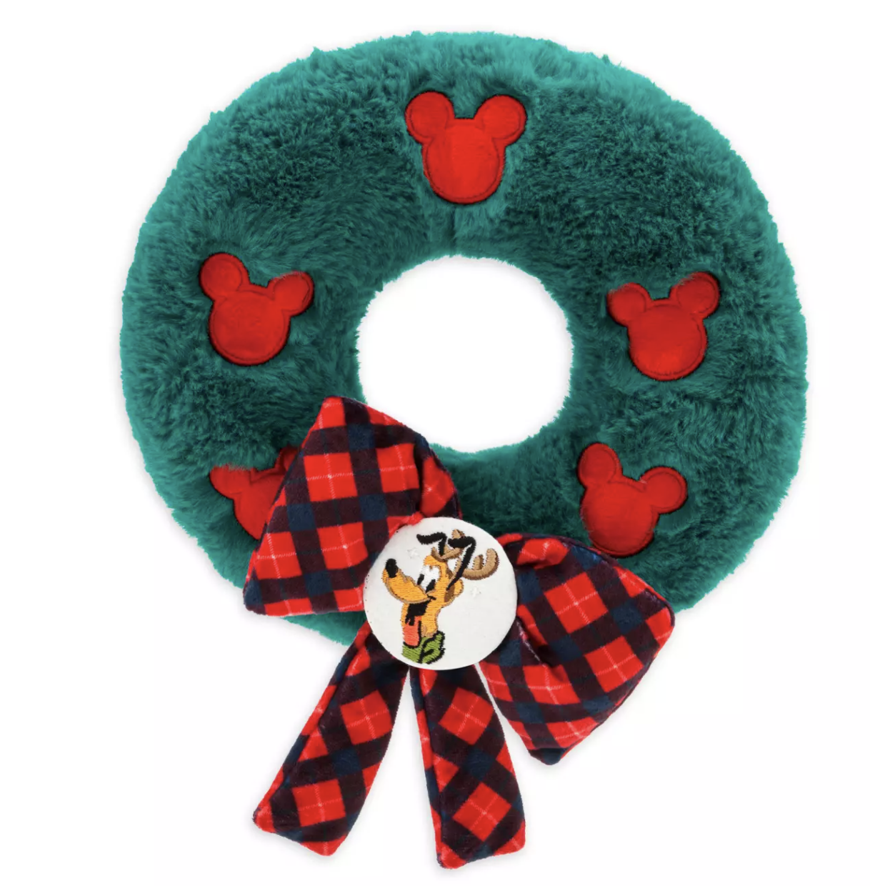 Bark the herald angels sing! Your fluffy friend will get in the holiday spirit with this festive squeeze toy. This soft padded wreath, featuring red Mickey icons and a plaid bow with Pluto, is the perfect bite-sized gift for your pet.