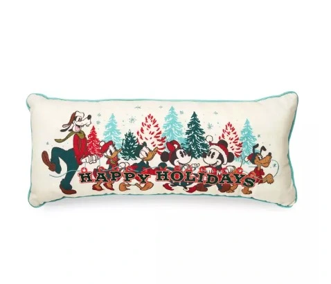 Make the season merry and bright when accenting your home décor with this festive throw pillow featuring Mickey and the gang plus ”Happy Holidays” greeting.