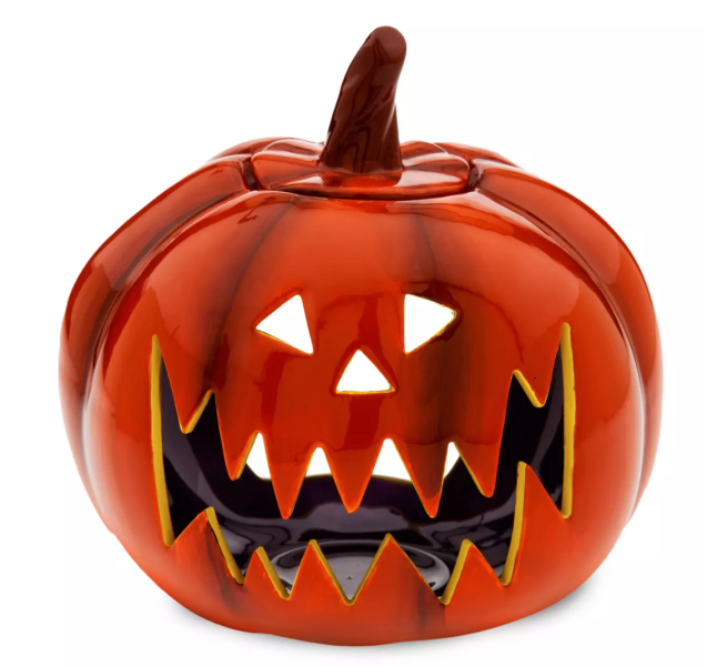 - Sculpted ceramic Jack-o’-Lantern candle holder with lid